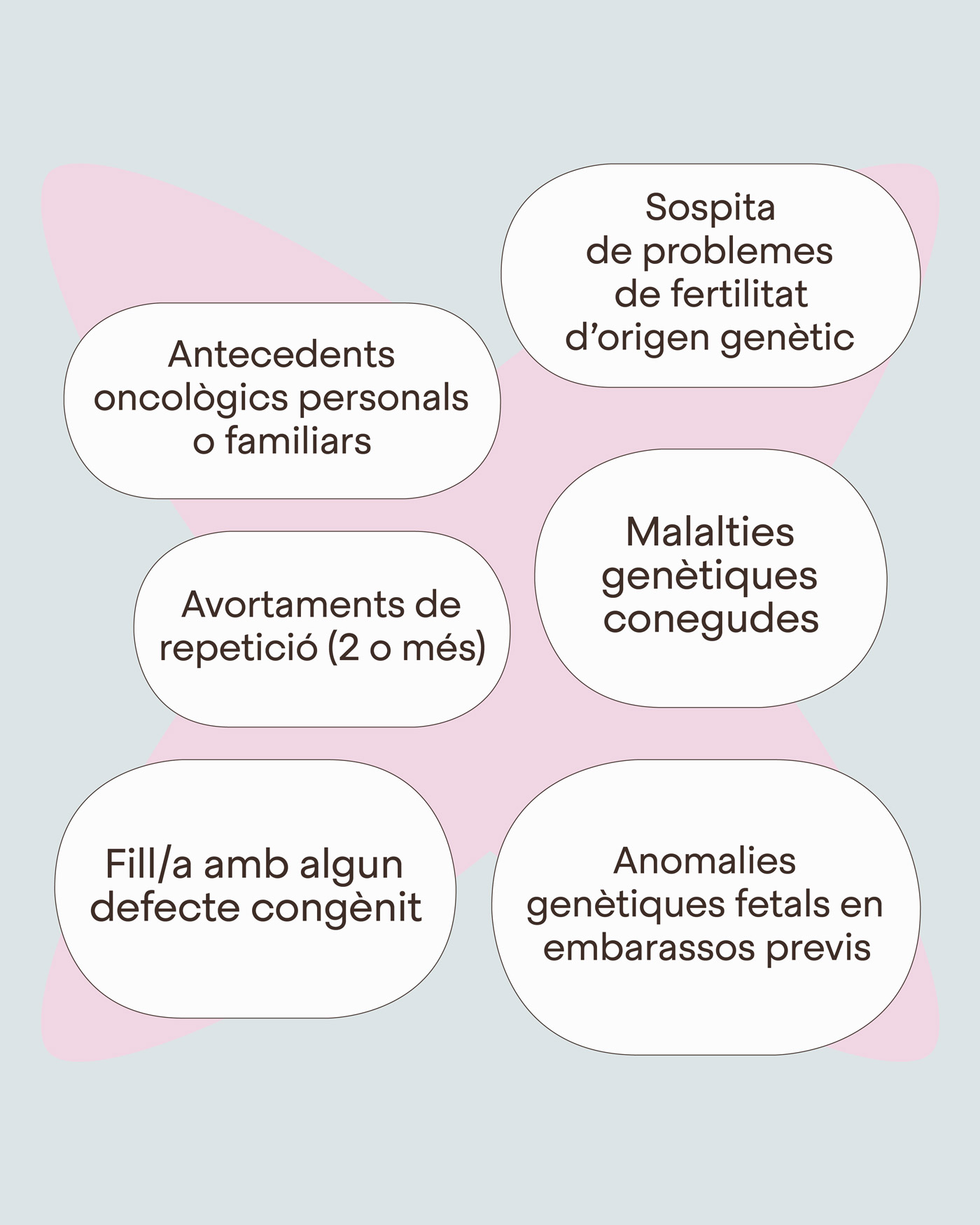 En cas que existeixin antecedents familiars que vulguis evitar transmetre, o bé en cas que desitgis conèixer el risc de recurrència d’aquestes malalties en la teva descendència, l’assessorament genètic ens ajudarà a prendre la millor decisió de salut personal i de planificació familiar.